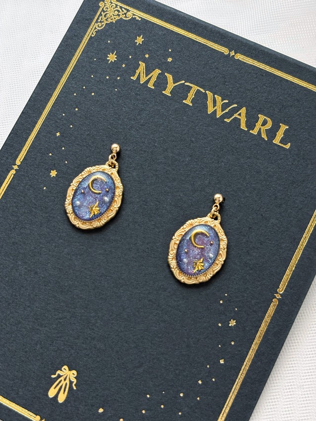 《こちらはイヤーパーツ選択できる完成品です》 星降る夜を、そっと耳元に 「夜空に瞬く星々は、遠い過去から届いた光。 ひとつひとつの輝きに、願いや夢を込めて。」 マイトワールの語源でもある "エトワール" という単語は 「星」という意味を持っています。 マイ=「私の」 エトワール=「星」 あなただけの星空なのです。 月は、優しさ•内なる力•女性性•静寂 を、 星は、希望•導き•願い•永遠 を象徴します。 小さな額縁に、星空を描きました。 心を込めて重ねた色の中で、 星と月のパーツが静かに輝く星空を 透明な樹脂で大切に閉じ込めています。 カメオのように、どこか懐かしく、 そして神秘的な星空。 あなたの心に寄り添う、静かな星の物語をどうぞ。 - 秘密の舞踏会 - 夜の奥にだけ開かれる誰にも知られない舞踏会の色。 静かな三拍子がどこからともなく流れ、星たちは光を纏う。 ⸻ ■ デザイン・素材について ・サイズ: オーバル額縁 小 (カン部分除く) 約 16 × 19 mm ・素材: 真鍮製 ニッケルフリー加工 ⸻ ■ お届けについて ・完成品はご注文後、《 1週間以内 》に発送 ・受注生産の際はご注文後、《 1カ月以内 》に発送 ・一点ずつ手作業で制作しているため、色や配置に個体差があります。 ⸻